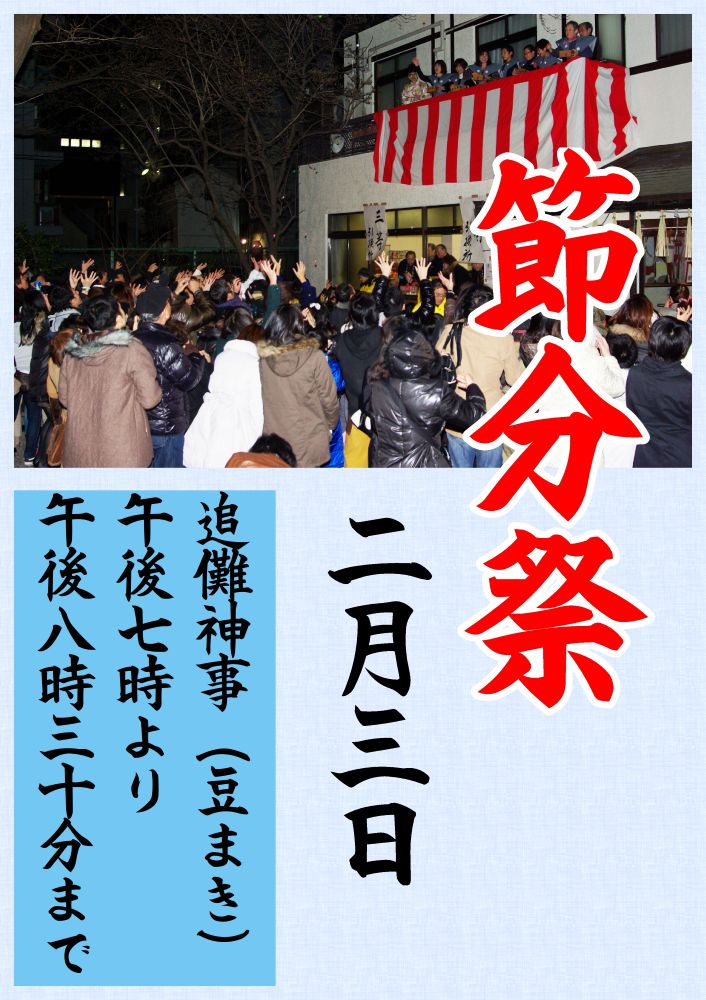 2月3日(火)の夜、境内で豆まき神事が行われます。その年の歳男、歳女に当たられる方がクジの入った福豆をまき、それを拾った参拝者が景品と引き換えて福をいただきます。総数約5000個の福豆を、幼児からお年寄りまで楽しそうに拾われています。豆まきは当日午後7時から、15分おきに8時30分まで、合計7回行われます。どうぞご参拝ください。